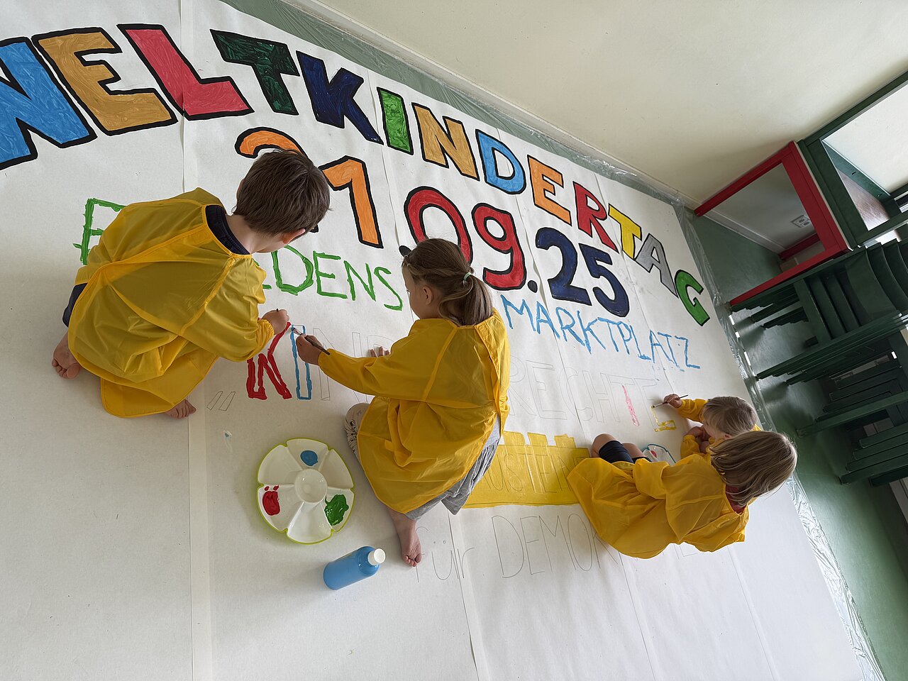 Am 21.09.2025 ist Weltkindertag – und die Kinder der Kita Kinderglück sind schon voller Vorfreude! Gemeinsam mit ihren Erzieher*innen und den Leitungen haben sie ein buntes Plakat gestaltet, das bald in der Nähe der Stadtmitte auf einer Werbetafel zu sehen sein wird.